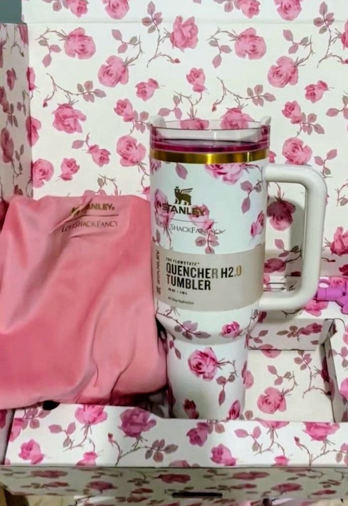 Stanley termos , çiçek desenli ve sağlam saplıdır. Yumuşak kılıf ve uyumlu çiçekli kutu ile birlikte gelir. 1.18 litrelik