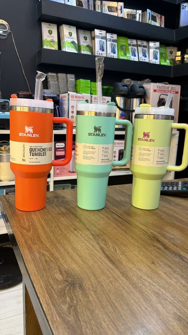 Turuncu, nane yeşili ve açık yeşil renklerde, saplı ve kapaklı Stanley Quencher tumbler bardaklar. İçecekler için kullanışlıdır.