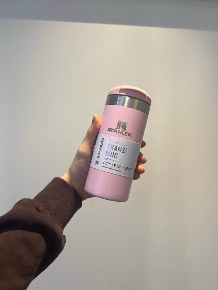 Stanley markalı pembe termos mug, içecekleri sıcak veya soğuk tutar. Güvenli kapak ve dayanıklı yapıya sahiptir. Pastel renk yumuşak bir görünüm sağlar. ☕