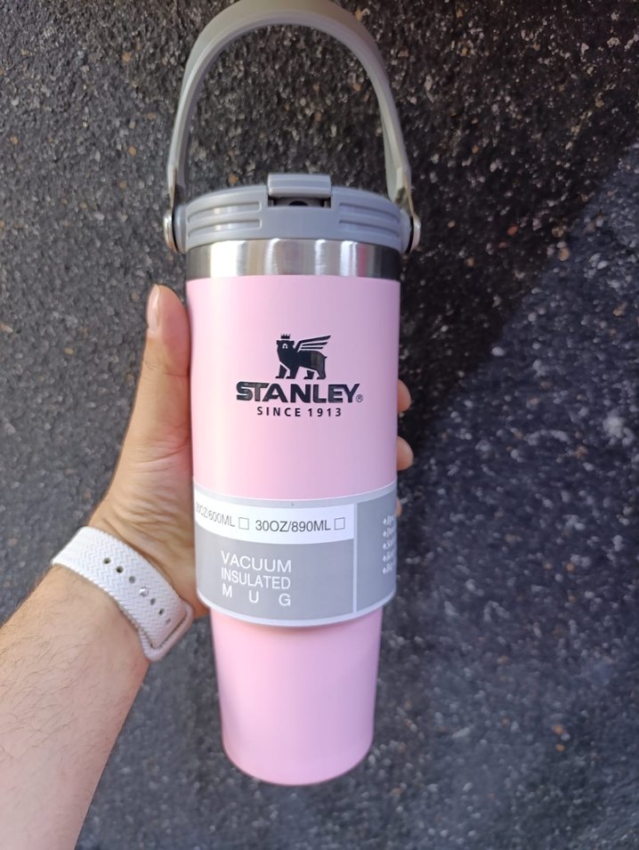 Stanley markasının pastel pembe renkli vakumlu termos bardağı, içecekleri sıcak veya soğuk tutar. Taşıma kulplu ve 800 ml hacmindedir 10 saatte kadar sıcak 10 saate kadar soğuk tutar