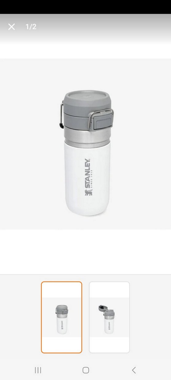 0.47L Stanley termos şişe, beyaz gövde ve gri kapak ile sıcak veya soğuk içecekleri korur. Taşıma için kilitli mekanizmaya sahiptir.