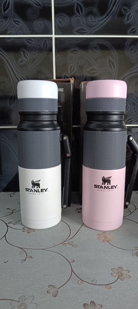 Stanley termos şişeleri, gri ve pembe renklerde, tutması kolay dokulu yüzey ve güvenli kapak özelliklerine sahiptir. İçecekleri sıcak veya soğuk tutar.