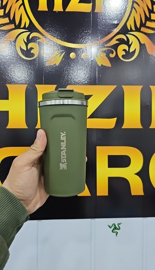 Stanley markalı haki renk çocuk termos şişesi, içeceklerin sıcak kalmasını sağlar ve güvenli kapaklıdır. Üzerinde 'R' harfi bulunmaktadır.