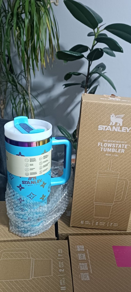 Stanley markalı, kulplu ve kapaklı turkuaz renkli termos bardak, içecekleri sıcak veya soğuk tutar. FlowState teknolojisi ile desteklenmiştir.