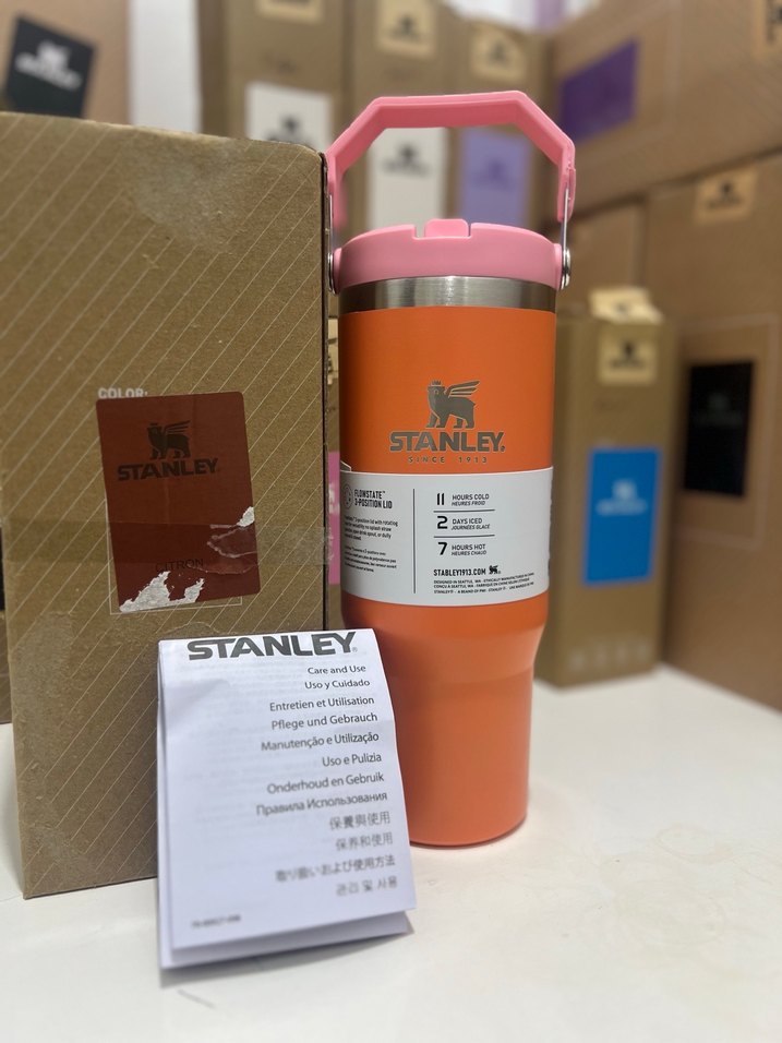 Stanley turuncu termos, açık pembe kulplu ve dayanıklı yapıya sahip. İçecekleri sıcak veya soğuk tutar. Bakım kılavuzu ile birlikte gelir.