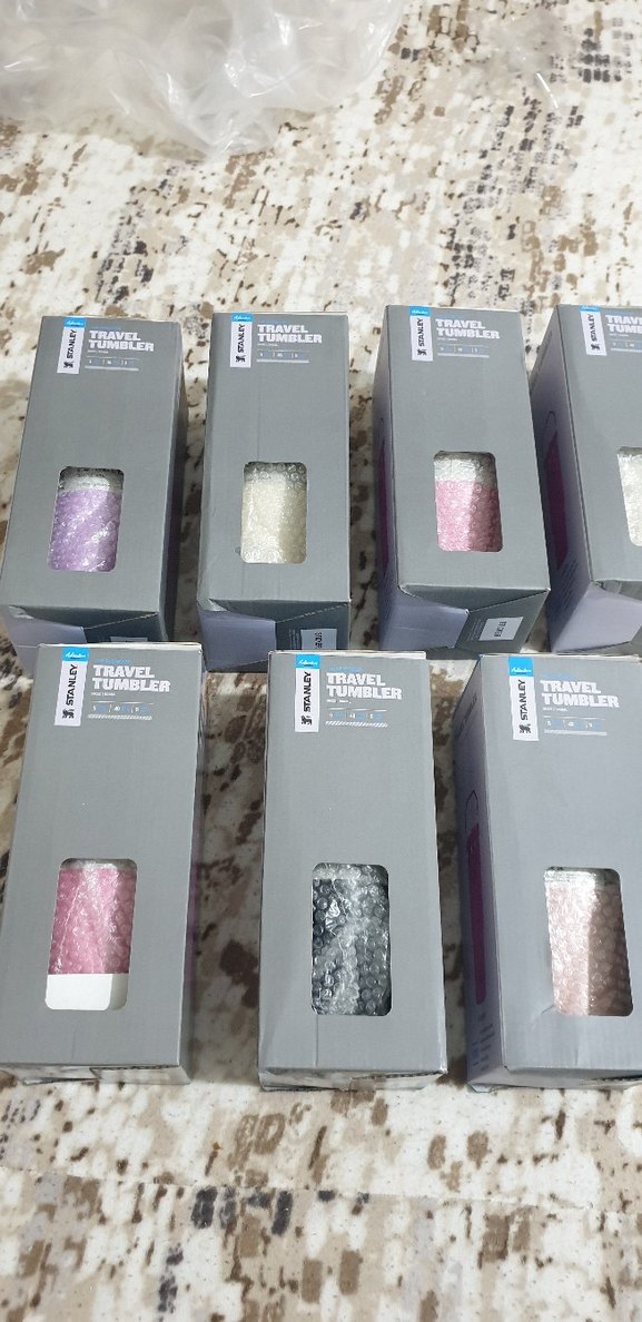 Gri kutularda çok renkli seyahat termosları, içlerinde dokulu yüzey görünür. Kutularda "TRAVEL TUMBLER" etiketi bulunur. ✈️ Stanley barkodlu modelleri