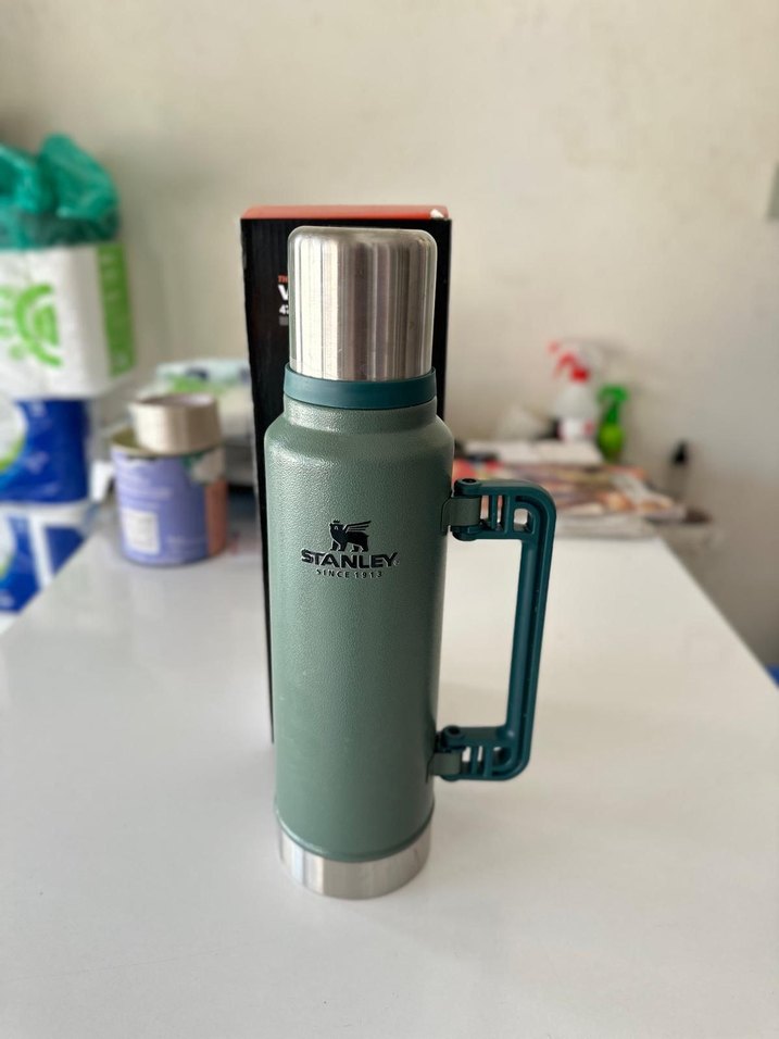 Stanley termos, yeşil çelik gövde, sağlam sap ve paslanmaz çelik kapak ile sıcak veya soğuk içecekleri saklar.