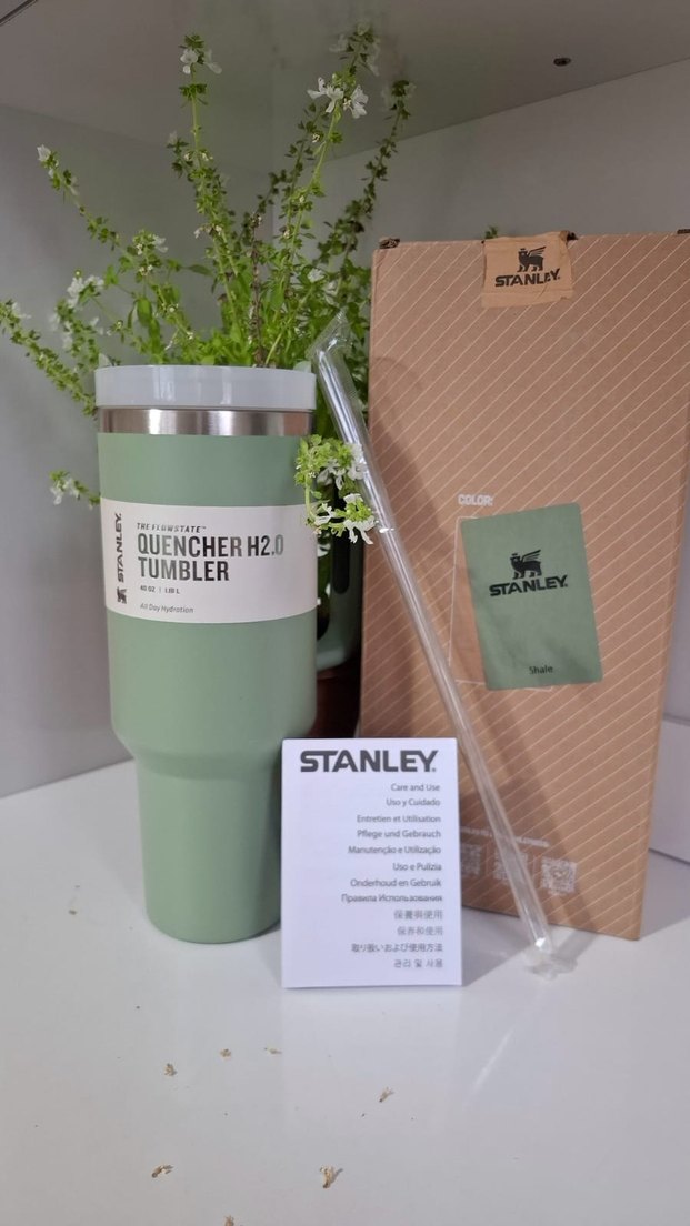 Stanley markalı, pastel yeşil çocuk termos şişesi. Dayanıklı, güvenilir izolasyona sahip, kolay içim için şeffaf pipet ve kapak içerir.