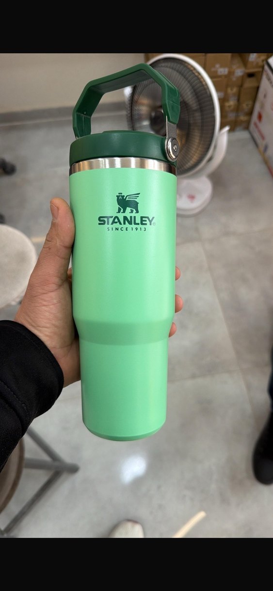 Stanley markalı pastel yeşil çocuk termosu, dayanıklı yapısıyla içecekleri sıcak veya soğuk tutar. Kolay taşıma için saplı ve sağlam kapaklıdır.