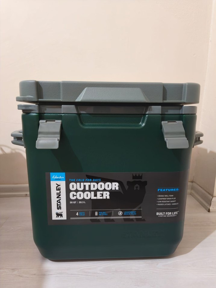Stanley marka koyu yeşil outdoor soğutucu kutusu, 30 qt kapasite ve sağlam kilitlerle dış mekan aktivitelerinde soğuk tutar. ❄️
