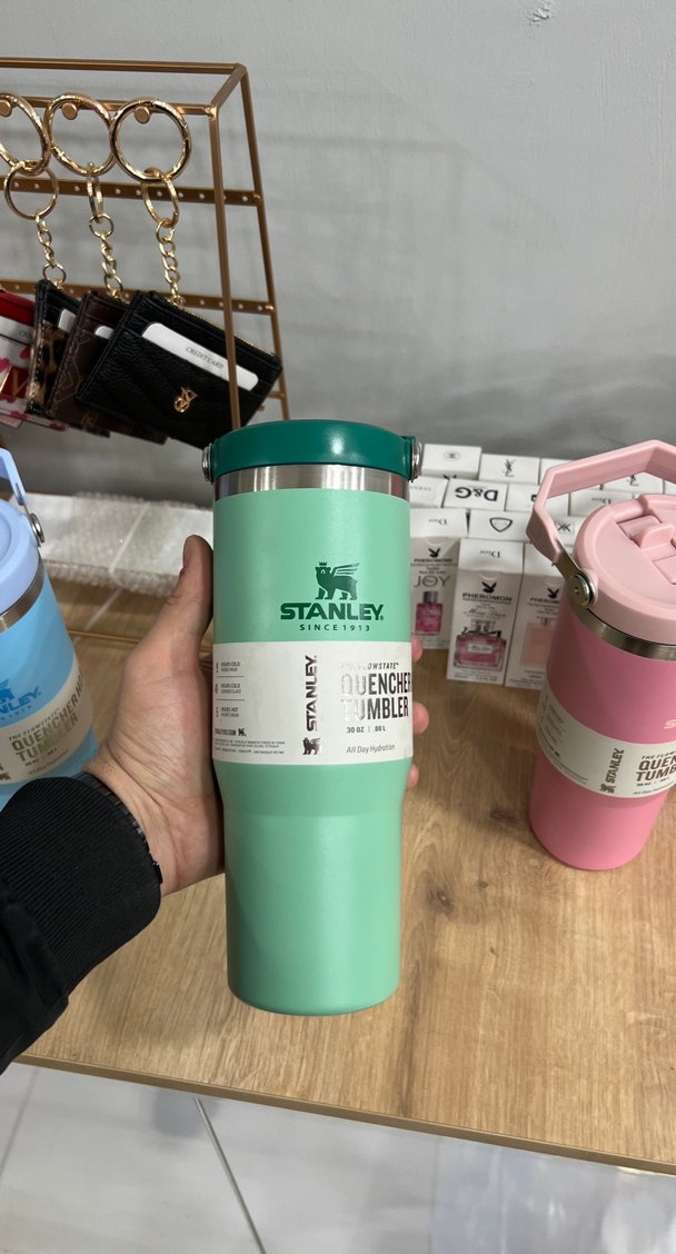 Stanley markalı pastel yeşil termos bardak, içecekleri saatlerce sıcak veya soğuk tutar. Paslanmaz çelik gövde ve güvenli kapak içerir.
