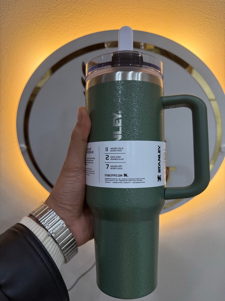 Stanley yeşil termos kupa, sağlam saplı ve güvenli kapaklıdır. 1,18 Lt hacme sahiptir ve içecekleri saatlerce sıcak veya soğuk tutar