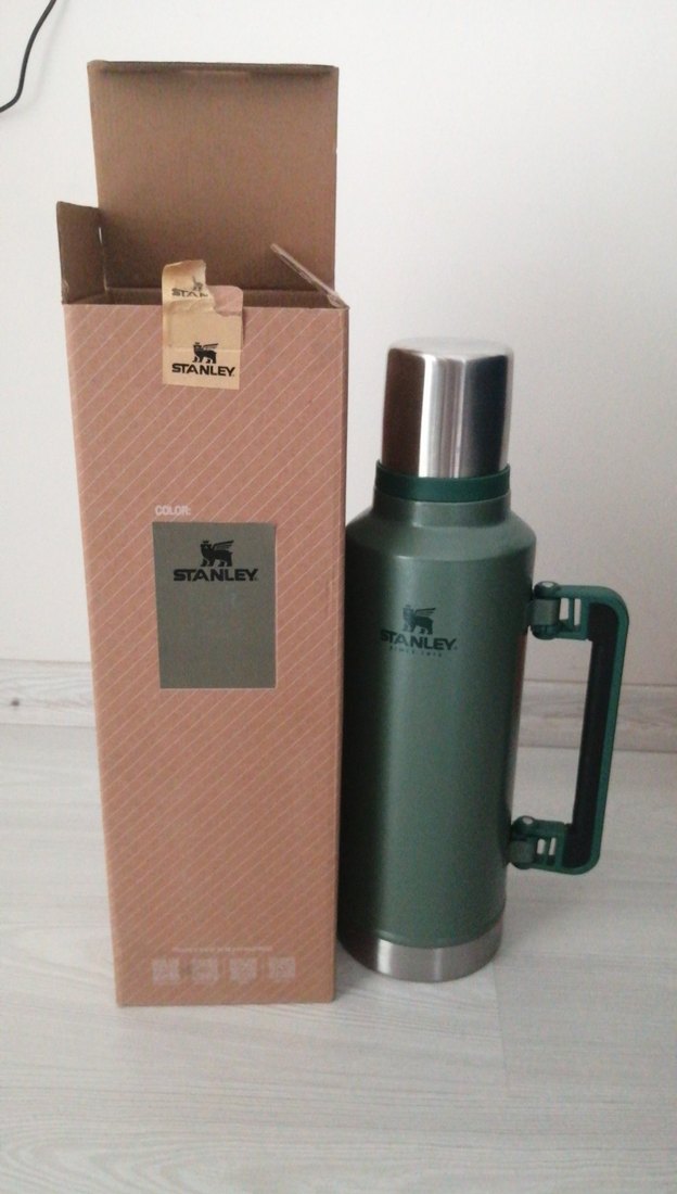 Stanley yeşil termos matara, sağlam sapı ve paslanmaz çelik kapağı ile içecekleri uzun süre sıcak veya soğuk tutar.