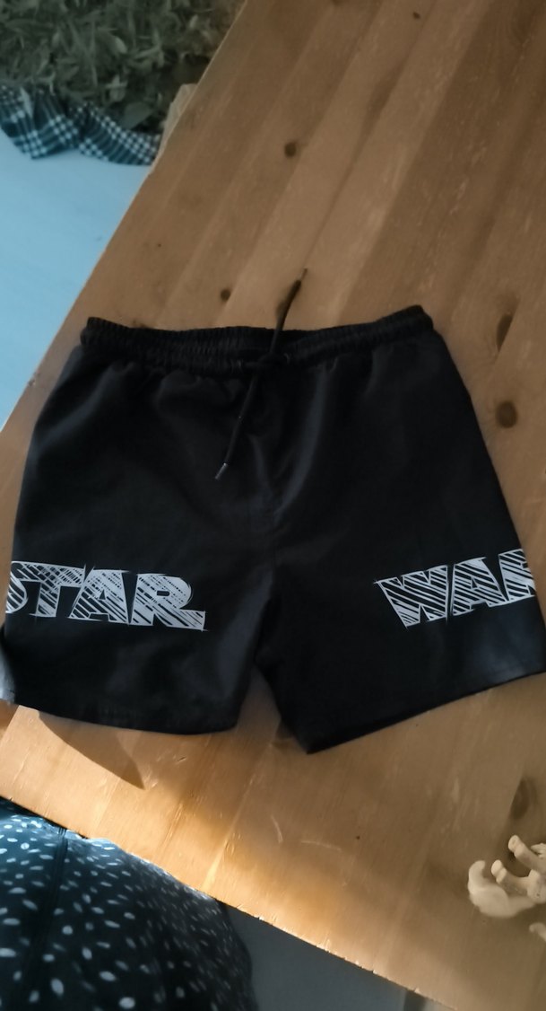 Star Wars baskılı, sentetik kumaştan siyah mini erkek mayo. Rahat ve bol kesim, velcro kapamalı, plaj için uygun. 9-10 yaş
