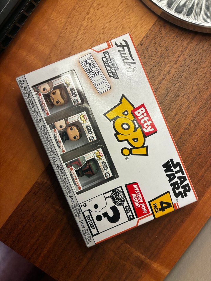 Star Wars temalı Bitty Pop! seti, koyu ve bej tonlarında dört küçük aksiyon figüründen oluşur. Bir tane sürpriz gizemli figür içerir.