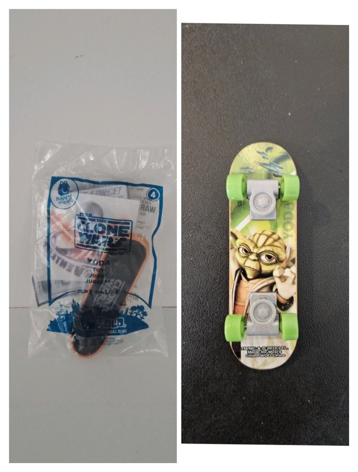 Star Wars Clone Wars Jedi Master Yoda Parmak Kaykayı. Yeni ve hiç açılmamış paketindedir. 2010 Mc Donalds promosyonudur. Uzunluk 9.5 cm civarıdır. Finger Skateboard Burger king Chewbacca Luke Skywalker Prenses Leia Palpatine Darth Vader R2 D2