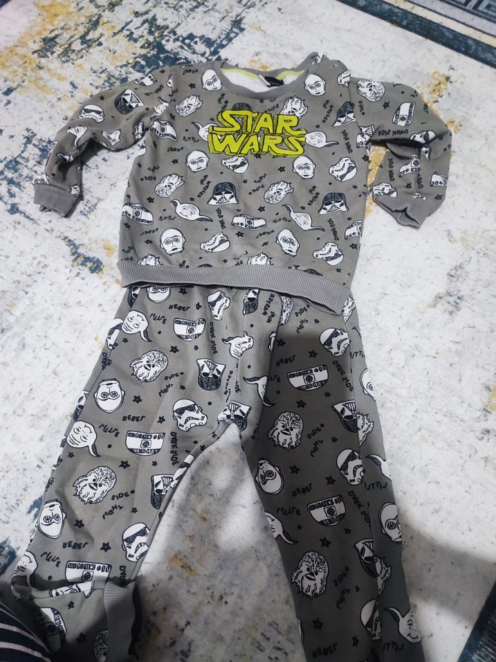 Gri triko kumaştan, bol kesim, uzun kollu ve bisiklet yaka erkek çocuk pijaması. Star Wars karakterleri ve logosu baskılıdır.