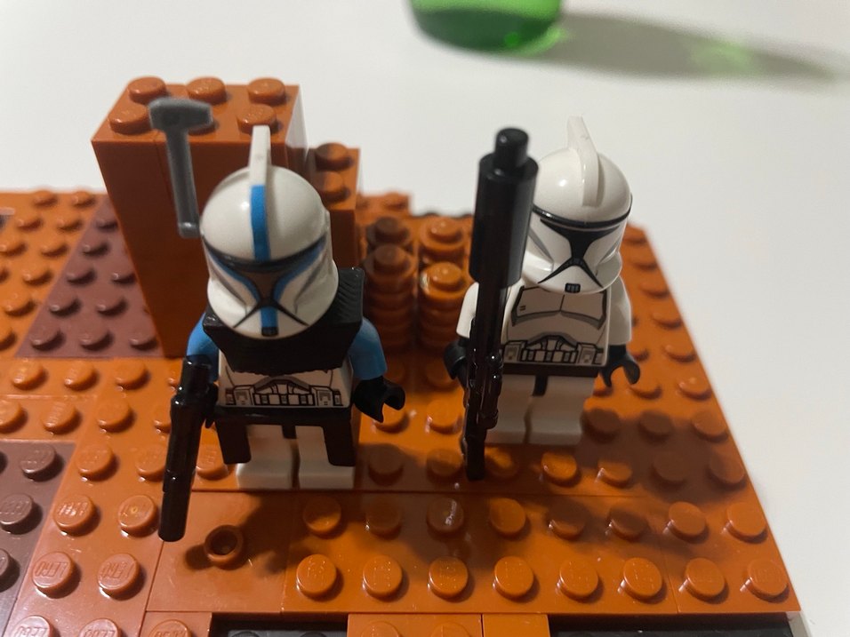 Detaylı miğfer ve zırha sahip iki Star Wars Lego klon asker figürü, kahverengi Lego tabanında duruyor. Bir figür siyah silah taşıyor. Dm’den yazmadan almayanınız