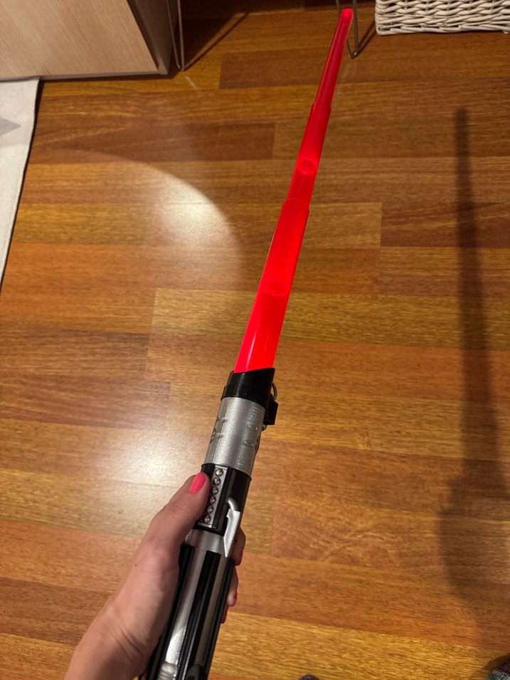 Kırmızı ışıklı bıçağa ve detaylı siyah sap kısmına sahip oyuncak kılıç. ✨