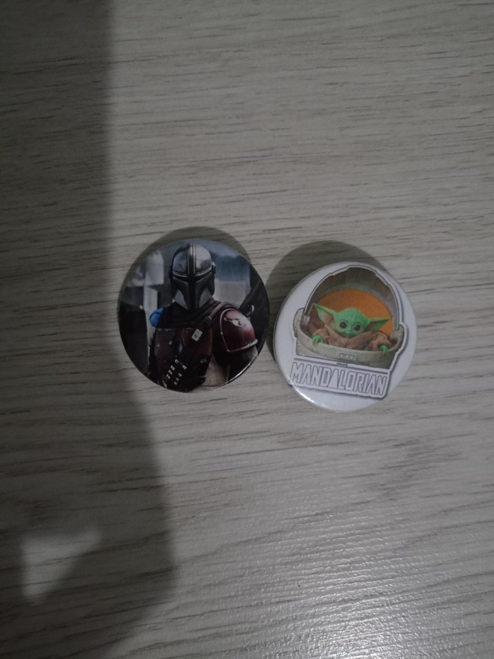 Star Wars Mandalorian ve Grogu figürlü, yuvarlak beyaz ve koyu renkli iki rozet seti. Grunge punk tarzına uygun