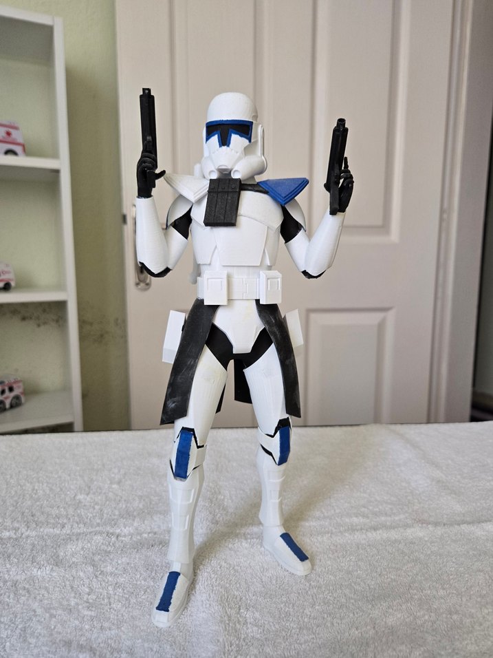 Beyaz ve mavi detaylara sahip bu aksiyon figürü, iki tabanca tutan dinamik bir pozda durmaktadır. Detaylı zırh ve kask içerir.
