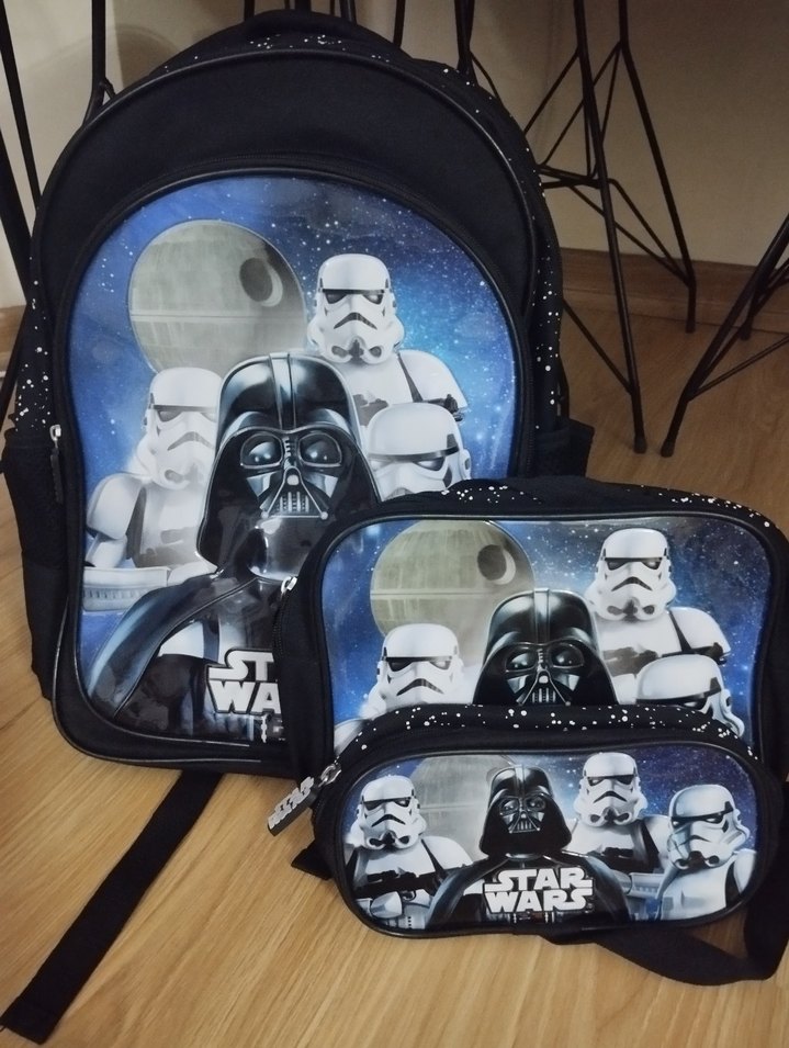 Siyah renkli çocuk okul çantası seti, Star Wars karakterleri Darth Vader ve Stormtrooper figürleriyle uzay temalıdır. Sırt çantası, beslenme çantası ve kalemlik içerir.