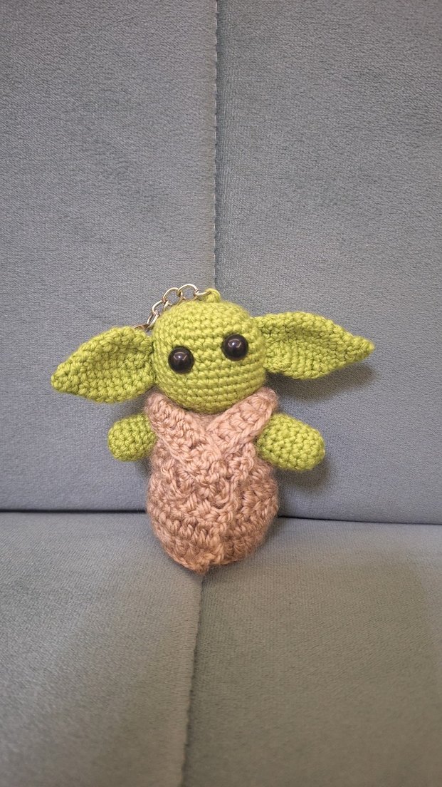Pastel renklerde, büyük kulaklı yeşil küçük karakter ve bej kıyafetli amigurumi oyuncak anahtarlık.star words anahtarlık el emeğidir