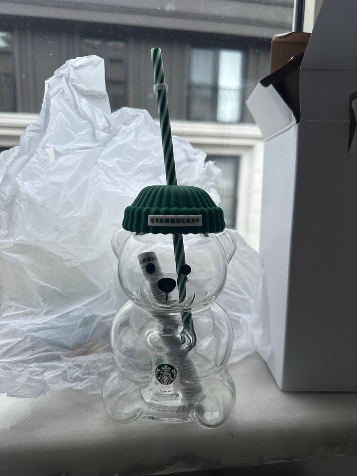 Koyu yeşil kapak ve çizgili pipetli, şeffaf ayıcık şeklinde Starbucks marka bebek biberonu.