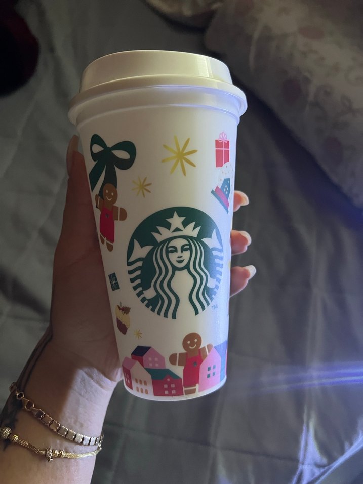 Beyaz renkli Starbucks termos bardak, tatil temalı çizimlerle süslenmiştir. Üzerinde zencefilli kurabiye figürleri, hediyeler ve yıldızlar bulunur. Kolay içim için kapaklıdır.