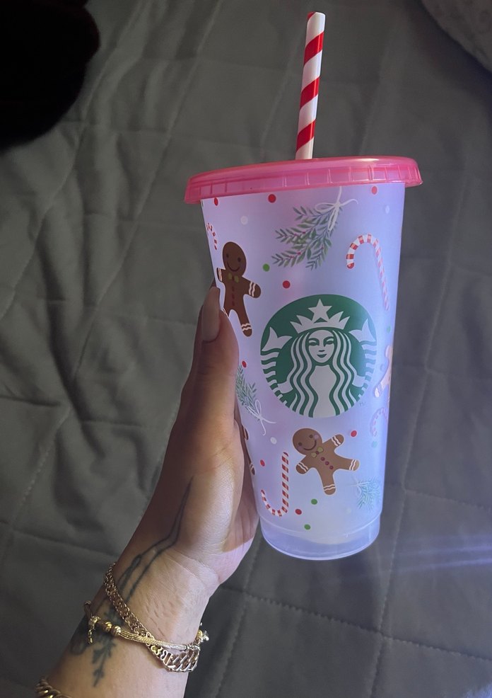 Starbucks logosu ve pastel pembemsi kapaklı, çizgili pipetli bardak, zencefilli kurabiye ve şeker kamışı desenleriyle süslenmiştir.