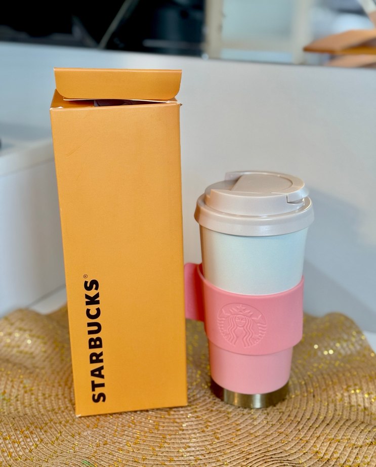Starbucks pembe tutacaklı, beyaz gövdeli ve kapaklı seyahat kupasıdır. Sıcak içecek taşımak için uygundur. ☕
