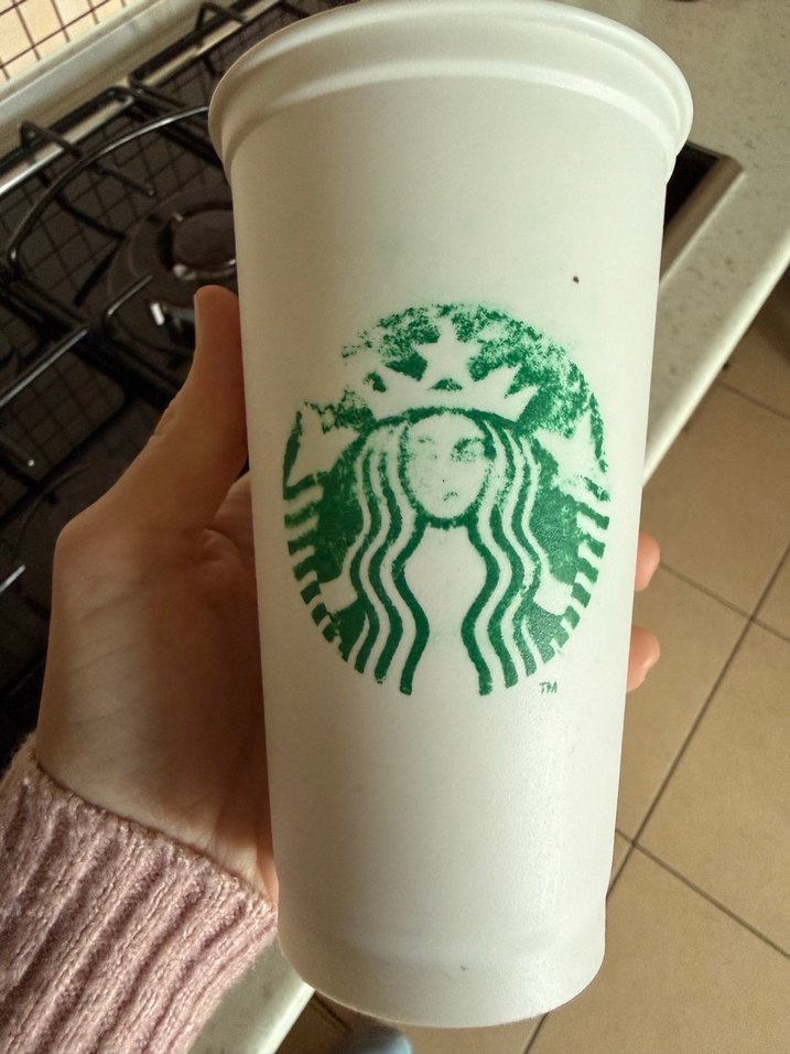 Beyaz zemin üzerinde açık yeşil Starbucks logosu bulunan bardak, sıcak veya soğuk içecekler için uygundur. Yazıları silindi ancak kapağı mevcut ve sızdırmaz. Halen kullanıma uygundur