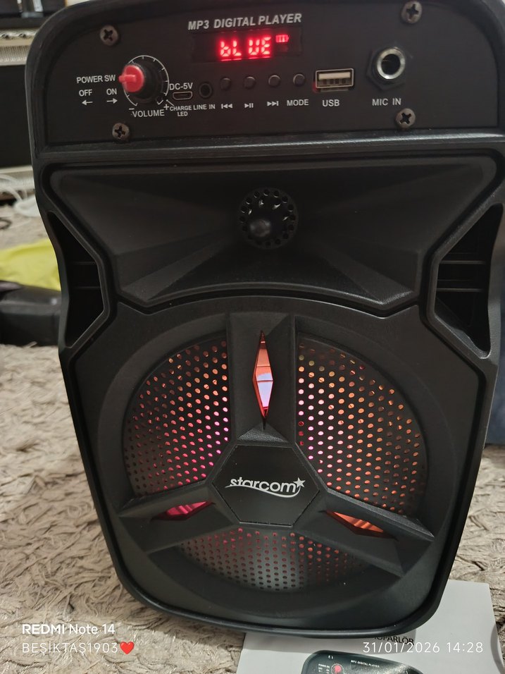 Starcomy siyah Bluetooth hoparlör, MP3 dijital oynatma, USB ve mikrofon girişleri ile ses kontrol düğmesi içerir. Bluetooth modu ve LED ekran bulunur. wifi Bluetooth herşeye bağlanır fazla kullanılmadı kutusu mikrofonu ile gönderilecektir sarz kablosu yoktur telefon sarziyla da sarz dolum yapıyor sıfır ayarında temiz
