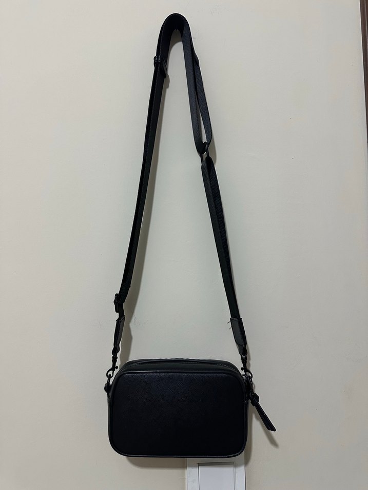 Siyah deri, bel detaylı kadın çapraz askılı çanta. Minimalist ve sade tasarımıyla günlük kullanıma uygundur.