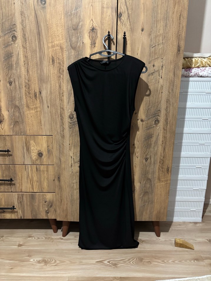 Stradivarius yüksek yakalı, kolsuz, drapeli ve vücuda oturan uzun siyah elbisedir. Minimalist gotik tarzda, özel gün veya günlük uygundur.