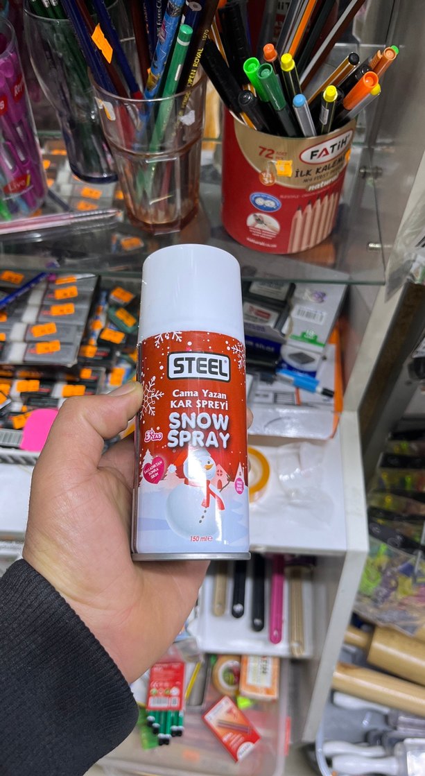 Steel markalı, cam yüzeylere yazmak için kullanılan renkli tasarımlı 150 ml kar spreyi. Kış temalı, kardan adam görseli içerir. ❄️