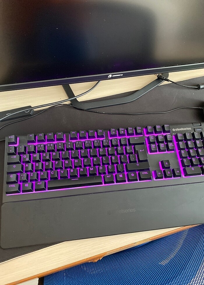 Arkadaki 2 ayaklıklardan 1 tanesi çıkık Her türlü renk özelliği Suya dayanıklı oyuncu klavyesi Dökülmelere karşı IP32 su koruması Oyunlara ve Discord'a karşı tepkili özelleştirilebilir 10 bölgeli RGB aydınlatma 20 milyondan fazla tuş basıma kadar fısıltı sessizliğinde oyuncu anahtarları Premium manyetik bilek desteği tam avuç içi desteği ve rahatlık sağlar. Ses düzeyini ve medyayı ayarlamak için özelleştirilmiş multimedya kontrolleri.