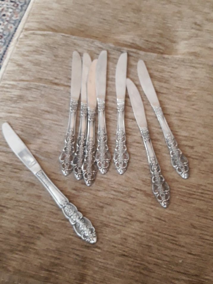 Stenly Steell marka Germany damgali 8 adet Gri ve beyaz işlemeli saplara sahip, detaylı desenli bıçak seti. Sofralarınıza şıklık katar.