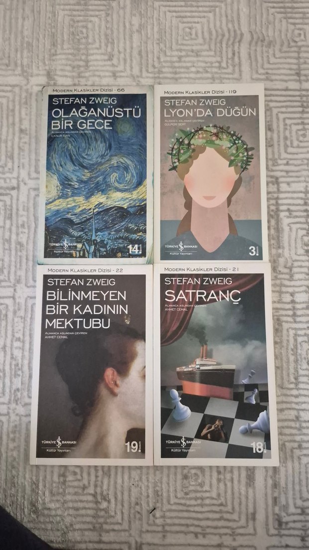 Stefan Zweig'in "Olağanüstü Bir Gece," "Lyon'da Düğün," "Bilinmeyen Bir Kadının Mektubu" ve "Satranç" kitaplarından oluşan set. Her biri farklı hikayeler sunuyor. Olağanüstü Bir Gece kitabı biraz yıpranmış durumda ve kenarlarında mavi boya lekesi var.
