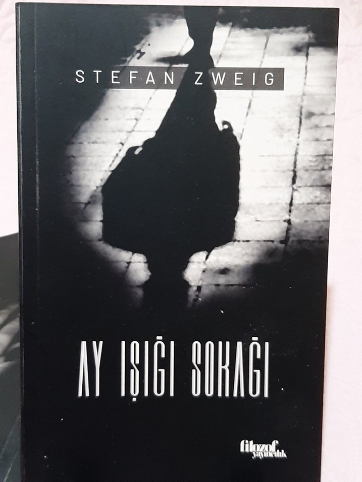 Stefan Zweig'in 'Ay Işığı Sokağı' adlı romanı, siyah beyaz kapakta gölgeli bir figür ve taşlı sokak görseli yer alıyor.