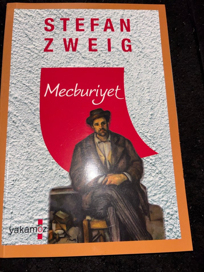 Stefan Zweig'in Yakamoz yayınlarından çıkan Mecburiyet romanı, klasik kapak tasarımında eski tarz giyimli bir adamın resmi yer alıyor.