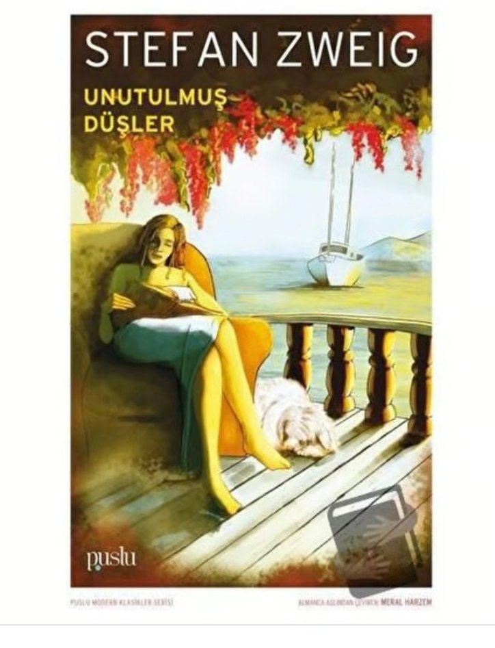 Stefan Zweig'in "Unutulmuş Düşler" adlı kitabı, deniz ve tekne manzaralı, kadının ve köpeğin olduğu kapak resmiyle Puslu tarafından yayımlandı.