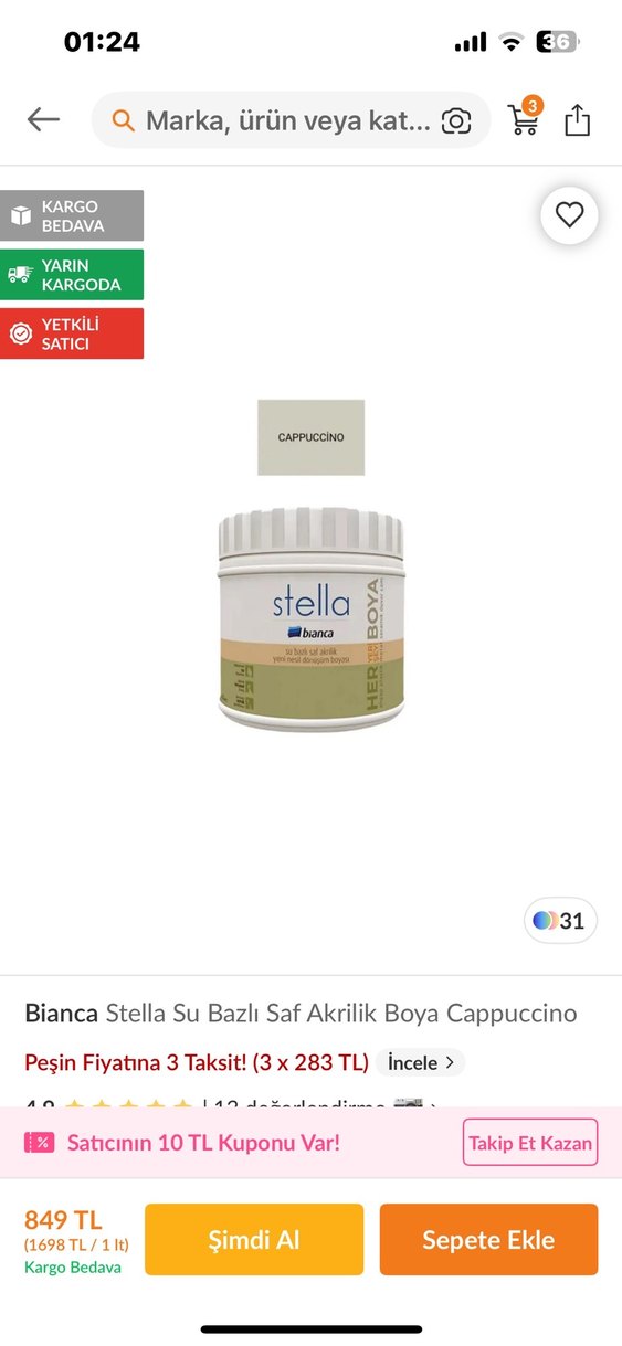 Stella Cappuccino su bazlı akrilik boya, pürüzsüz ve dayanıklı kaplama sağlar. Yumuşak cappuccino tonundadır. 0,5 litredir.. Hiç kullanılmamış, paketlidir