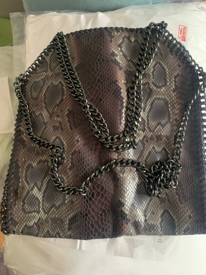 Kahverengi deri, yılan derisi deseni ve zincir detaylı kadın çantası, günlük kullanıma uygun goth ve avangard tarzda.stella mc cartney orjinal değil