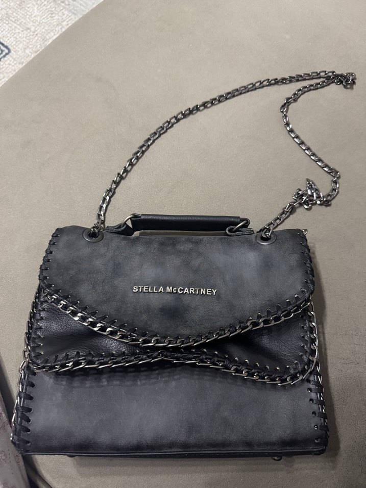 Gri deri çanta, zincir detayları ve baskılı deseni ile günlük kullanıma uygun, trendi ve minimalist tarzda. Üzerinde STELLA McCARTNEY yazısı bulunur. Hiç kullanılmadı orijinal değildir