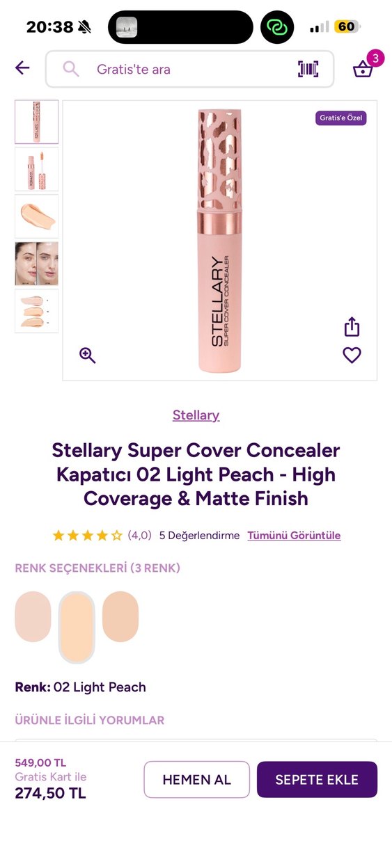 Stellary Super Cover 02 Light Peach kapatıcı, yüksek kapatıcılık ve mat bitiş sunarak kusurları doğal şekilde gizler.