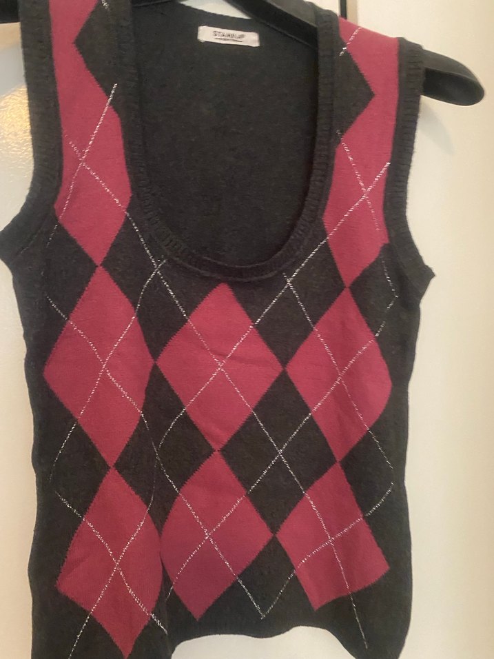 Bordo renkte, V yaka ve fitted kesime sahip kadın triko süveter. Örgü dokusu ve argyle deseni ile günlük kullanıma uygundur. Az kullanılmıştır..