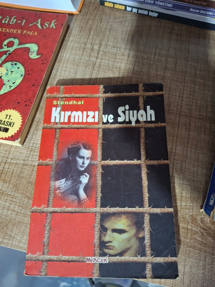 Stendhal'ın "Kırmızı ve Siyah" romanı, Mercek yayınevi tarafından basılmış, kırmızı ve siyah renklerle bölünmüş kapağı ve iki portresi bulunuyor.