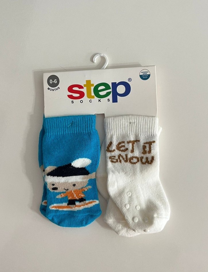 Step markalı, renkli baskılı erkek bebek çorapları. Birinde oyuncu karakter, diğerinde 'LET IT SNOW' yazısı bulunur. 0-6 ay için uygundur.