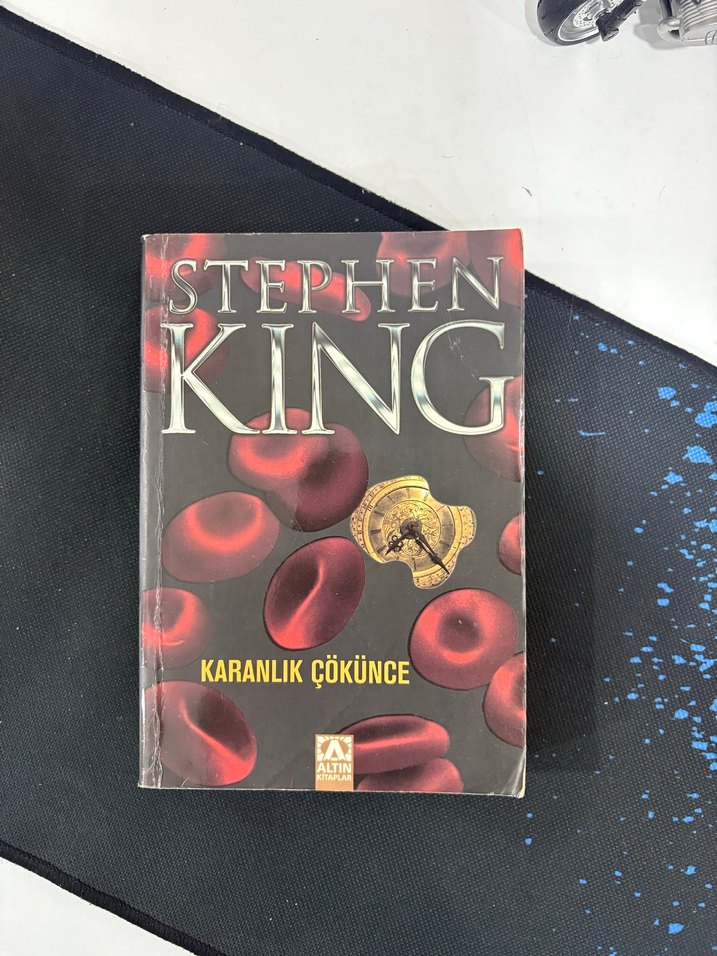 Stephen King'in "Karanlık Çökünce" romanı, kırmızı kan hücreleri ve anahtar görseliyle dikkat çeken gizemli bir kapak tasarımına sahip.